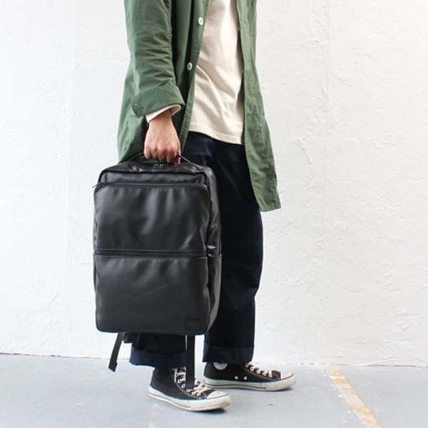 item information 品番 146-16103 品名 吉田カバン ポーター タイム ブラック デイパック カラー 10ブラック 素材 表:牛ステア (クローム鞣し) (スコッチガードTM加工) 裏:ナイロンオックス (表面:テフロン(R)ファブリックプロテクター加工) (裏面:ウレタンコーティング) 付属:コーデュラ(R)ナイロンツイル (表面:テフロン(R)ファブリックプロテクター加工) (裏面:PVC加工) 生産国 日本 サイズ メイン:約W29×H43×D16cm ショルダーベルト長さ:約44〜85cm 重さ 約1040g / 20L 備考 仕様:【メイン収納】二気室※B4対応前部:ファスナーポケット×1、オープンポケット×2 後部:メッシュクッションオープンポケット(15インチPC対応)×1 フロント収納:上部:ファスナーポケット×1(ファスナーポケット×1内蔵)下部:ファスナーポケット×1(オープンポケット×2内蔵) サイド収納:オープンポケット×2 付属品:収納袋model:170cm PORTER TIME BLACK DAY PACK / ポーター タイムブラック 146-16103 デイパック model:170cm model:183cm model:183cm スタンダードなルックスに高い機能性を備えたビジネスシリーズ「TIME」としての特徴はそのままに、メイン素材を革にアップグレードし、全体をブラックワントーンにすることで上品でシックな印象に。